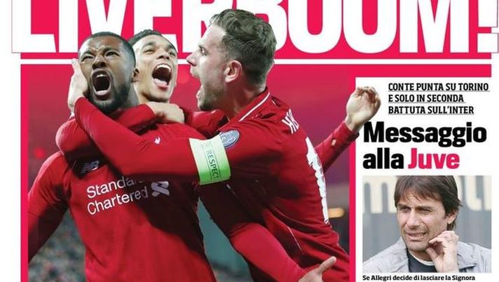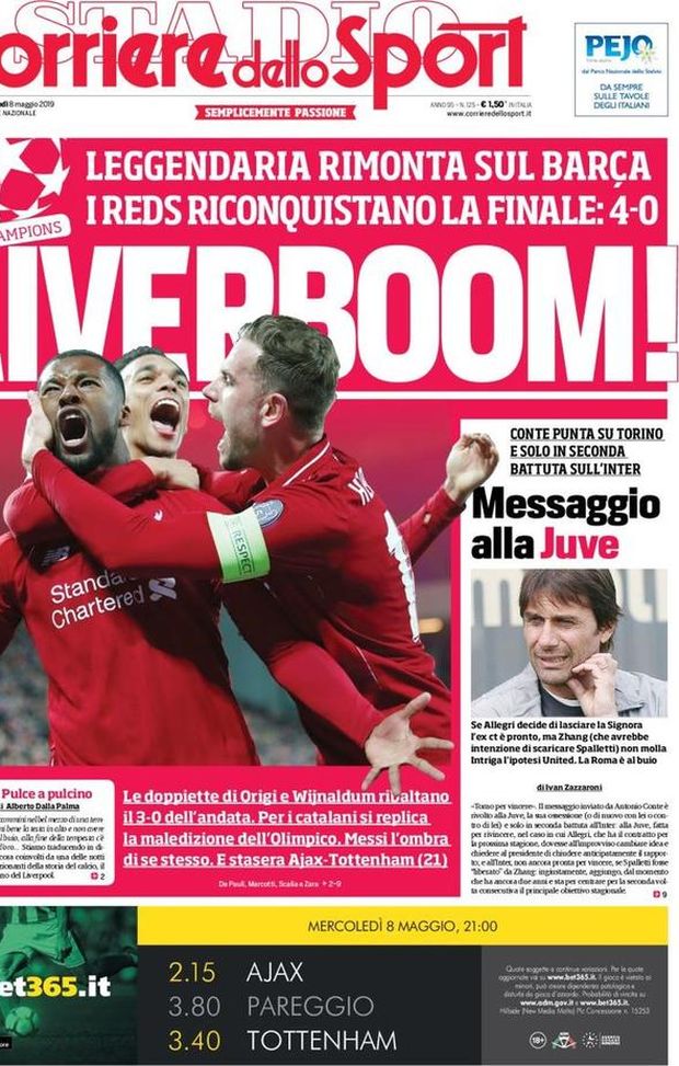 Del suo futuro si parla un giorno sì e l'altro pure. Antonio Conte intanto semina indizi rilasciando un'intervista qua e là. Quella che ha rilasciato a La Gazzetta dello Sport ai microfoni di Walter Veltroni ha chiarito che non andrà alla Roma e ora Juve e Inter sono alla finestra. Il Corriere dello Sport in edicola oggi titola così un editoriale del direttore, Ivan Zazzaroni: "Messaggio alla Juve. Conte punta su Torino e solo in seconda battuta sull'Inter. Se Allegri decide di lasciare la Signora, l'ex ct è pronto. Ma Zhang (che avrebbe intenzione di scaricare Spalletti) non molla. Intriga l'ipotesi United. La Roma è al buio". Ovviamente la notizia principale è la leggendaria rimonta del "Liverboom" (il Liverpool) sul Barcellona: gli uomini di Klopp in finale a Madrid dopo un'impresa straordinaria.