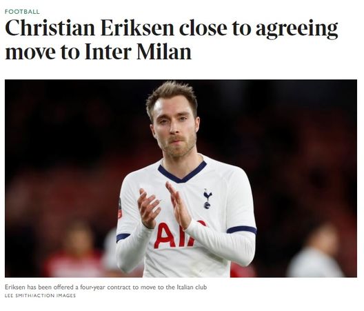 Christian Eriksen si avvicina a grandi passi verso l'Inter. Secondo quanto riporta il Times, il centrocampista danese ha raggiunto un accordo con i nerazzurri sulla base di 100 mila sterline alla settimana, circa 5,2 milioni di sterline l'anno (6,1 milioni di euro, anche se le cifre che circolano in Italia sono diverse). Al regista danese è stato offerto un contratto di quattro anni per trasferirsi a Milano. Dall'altra parte il Tottenham spinge per cederlo in questa finestra di mercato per circa 20 milioni di sterline per non perderlo a zero in estate.