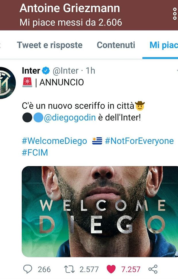 Diego Godin è un nuovo giocatore dell'Inter: una notizia che circolava ormai da mesi, e che è diventata ufficiale questa mattina con l'annuncio da parte del club nerazzurro. Un risveglio decisamente dolce per i tifosi interisti, che hanno commentato con entusiasmo l'arrivo del difensore uruguayano. Tra i tanti likes lasciati sotto al post del club nerazzurro ne è spuntato uno destinato ad alimentare le fantasie dei supporters dell'Inter: quello di Antoine Griezmann, attaccante dell'Atletico Madrid, grande amico di Godin e suo compagno di squadra per cinque stagioni. Il fuoriclasse francese ha annunciato il suo addio ai colchoneros e pare destinato a vestire la maglia del Barcellona, ma l'ufficialità fin qui non è ancora arrivata: che i due possano ritrovarsi ancora insieme, questa volta a Milano? Difficile, se non impossibile. Ma intanto il popolo nerazzurro sogna...