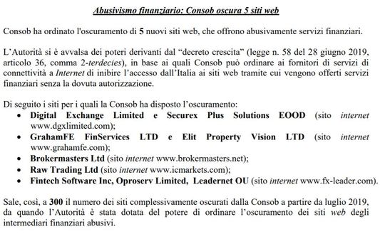 IC Markets sembrava destinato a diventare sponsor di manica dell'Inter. L'annuncio però non è ancora arrivato e il motivo potrebbe essere emerso in questi giorni. La Consob, come comunicato attraverso un documento ufficiale, ha ordinato negli ultimi giorni l'oscuramento in Italia di cinque siti web che offrono abusivamente servizi finanziari.