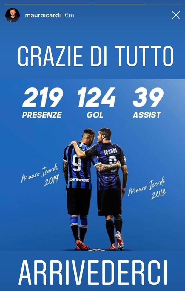 Sei stagioni dopo, Mauro Icardi lascia l'Inter. L'attaccante argentino è stato ceduto in prestito con diritto di riscatto al Paris Saint-Germain. Una storia d'amore, quella tra Maurito e l'inter, iniziata bene, con alti e bassi, ma finita male. Attraverso Instagram Stories, l'attaccante argentino ha postato una foto con due Icardi che si abbracciano, mettendo in evidenza i numeri raccolti con la maglia nerazzurra: "219 presenze, 124 gol e 39 assist. Grazie di tutto. Arrivederci", è il messaggio di Icardi rivolto all'Inter.