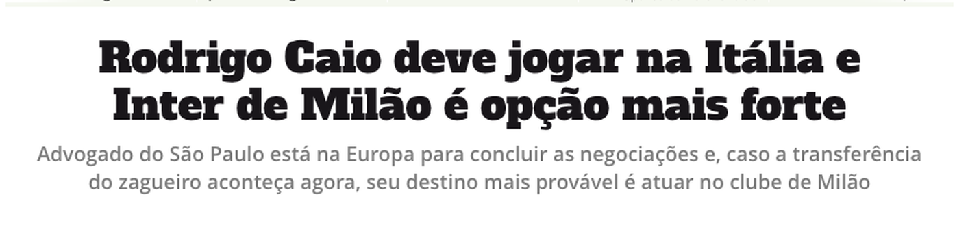 Il difensore del San Paolo, Rodrigo Caio, è nel mirino di molti club stranieri. Secondo Lance, Alexandre Pássaro, avvocato del San Paolo, è in Europa per parlare con alcuni club, con l'Inter che sembra l'opzione più forte. La cessione del difensore è importante vista la delicata situazione finanziaria del club brasiliano che ha un debito di 26 milioni di euro. Il difensore di 23 anni, campione olimpico nel 2016 e convocato dal ct Tite per difendere la squadra brasiliana in amichevole il prossimo mese, ha recentemente prolungato il suo contratto con il San Paolo fino a ottobre 2021. Rodrigo Caio ha sempre espresso il suo desiderio di giocare in Europa ed è stato vicino al Monaco nel 2014 e all'Atletico Madrid nel 2015. Nell'ultima finestra di trasferimento, ha rifiutato un'offerta dell'Amburgo. In questo caso non rifiuterebbe l'Inter, uno dei club più importanti nel mondo, scrive Lance.