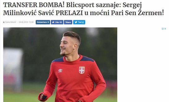 "Sergej Milinkovic Savic è ad un passo dal Psg". E' quanto svela oggi il quotidiano serbo "Blic", secondo cui l'operazione è ormai praticamente definita. "Milinkovic è formalmente ancora un giocatore della Lazio ma le trattative per il suo trasferimento in Francia sono entrate nella fase conclusiva. C'è già l'accordo sulla cifra da destinare alla Lazio e sull'ingaggio, anche se queste cifre non sono ancora note", spiega il quotidiano.