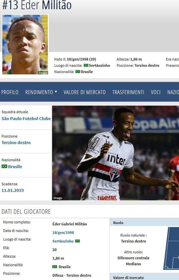 Eder Militao è l'ultimo nome finito nell'orbita dell'Inter. Il difensore del San Paolo, vent'anni, è già da tempo nel mirino del Manchester City ma, secondo la Gazzetta dello Sport, "Ausilio nei giorni scorsi ha sondato la disponibilità di alcuni club di A per portare in Italia il centrale difensivo classe ‘98 del San Paolo: c’è da vincere la concorrenza del Manchester City, ma guai a disperare".