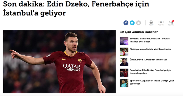 Finita la stagione com la qualificazione in Champions League, l'Inter guarda già al prossimo mercato. L'attenzione sarà rivolta soprattutto all'attacco, dove Icardi e Perisic sono in uscita. Al momento Edin Dzeko sembra il giocatore più vicino ai nerazzurri, ma secondo quanto riportano i media turchi, oggi il bosniaco si recherà a Istanbul per parlare con il Fenerbahce. Accompagnato dal suo agente, il giocatore parlerà con il presidente del club turco, Ali Koc.