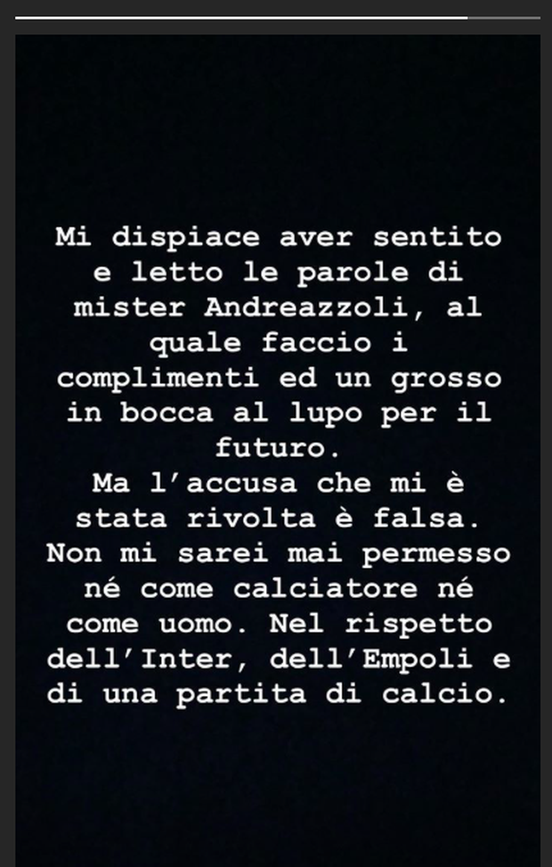 “Mi dicono che Gagliardini alla fine abbia buttato un pallone in campo per perdere tempo, dispiace molto, è anche un Nazionale. Anche i raccattapalle erano più veloci a restituire i palloni quando l’Inter doveva segnare. Ne prendo atto, va bene così e lo accetto. Mi complimento con la classe arbitrale, tranne che per l’episodio che ha portato al calcio di rigore che per fortuna non ha influito nel match”, aveva detto ieri sera Aurelio Andreazzoli al termine di Inter-Empoli in conferenza stampa. Parole arrivate all'orecchio di Roberto Gagliardini, che ha subito puntualizzato con una nota pubblicata su Instagram: "Mi dispiace aver sentito e letto le parole di mister Andreazzoli, al quale faccio i complimenti ed un grosso in bocca al lupo per il futuro. Ma l'accusa che mi è stata rivolta è falsa. Non mi sarei mai permesso né come calciatore né come uomo. Nel rispetto dell'Inter, dell'Empoli e di una partita di calcio".