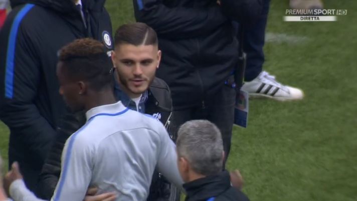 Mauro Icardi, infortunato, era in campo per il riscaldamento dei compagni