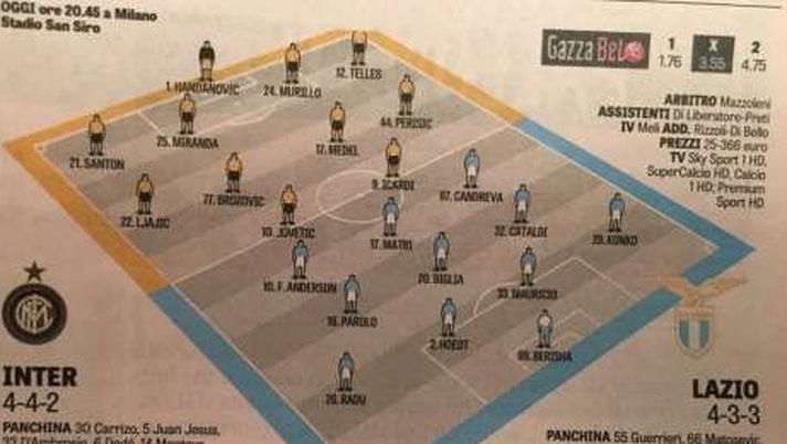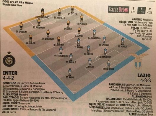 Questa sera si giocherà Inter-Lazio a San Siro, Roberto Mancini è pronto a stupire nuovamente con qualche sorpresa nella formazione titolare, ma secondo la Gazzetta dello Sport i nerazzurri dovrebbero schierarsi questa sera con un 4-4-2 abbastanza offensivo. Rientra Santon sulla destra, solita coppia Miranda-Murillo in mezzo e Telles sulla sinistra; a centrocampo Medel e Brozovic, sulle fasce Ljajic e Perisic e in attacco la doppia Jovetic-Icardi.