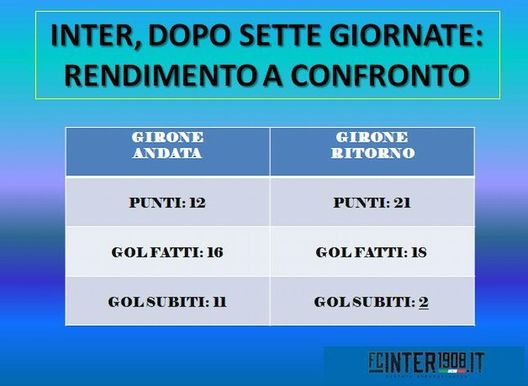 All'andata nelle prime sette gare di Serie A, erano stati fatti 12 punti, 16 gol e 11 erano i gol subiti. Nelle sette giornate del girone di ritorno i punti conquistati dai nerazzurri sono 21, 18 i gol fatti e 2 i gol incassati. La formazione interista ha sempre segnato e tanto. Ma subiva molto di più a inizio campionato.