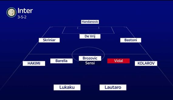 Handanovic; Skriniar, De Vrij, Bastoni; Hakimi, Barella, Brozovic (Sensi), Vidal, Kolarov, Lautaro, Lukaku.