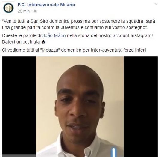 Joao Mario ha esordito contro il Pescara e ci sarà anche contro la Juventus in campionato. Per questo ha invitato i tifosi dell'Inter ad essere presenti al Meazza per il derby d'Italia e ha lanciato il suo messaggio attraverso la pagina Facebook della società: "Venite tutti a San Siro domenica prossima per sostenere la squadra, sarà una grande partita contro la Juventus e contiamo sul vostro sostegno", ha detto.