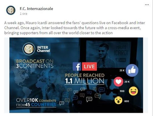 "L'evento ha coinvolto i tifosi nerazzurri di tutto il mondo, è stato trasmesso in tre continenti, 1.1 mln di persone hanno visto l'evento su Facebook in diretta e sono arrivati 25mila like e poi altre reazioni sotto il post: 20mila cuoricini, 900mila facce divertite (ahah) e 800mila faccine stupite (wow). Sono arrivati inoltre oltre i 40mila commenti da 45 Paesi diversi.