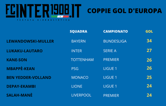 La coppia di attaccanti dell'Inter conferma di trovare la porta con grande facilità. In Europa sono la seconda coppia più prolifica, considerando i 5 campionati più importanti (Serie A, Bundesliga, Ligue 1, Premier League e Liga). Meglio dei due nerazzurri solo il duo del Bayern Lewandowski-Müller.