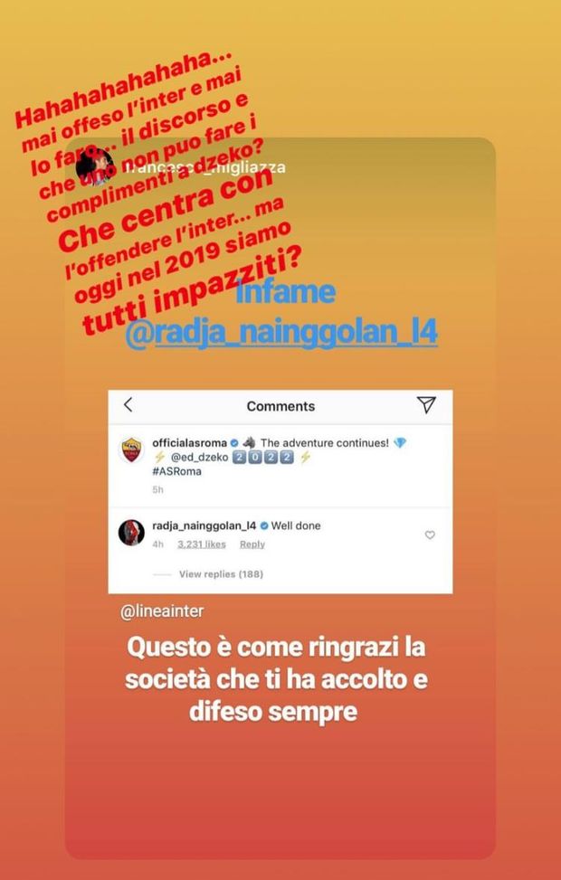 Radja Nainggolan spiega il suo punto di vista. Il centrocampista belga, passato in prestito dall'Inter al Cagliari nel corso di questa estate, ha fatto ieri i complimenti su Instagram ad Edin Dzeko, obiettivo di mercato dei nerazzurri, per la firma sul rinnovo di contratto con la Roma. Ciò ha portato del malumore all'interno della tifoseria dell'Inter, che sui social non he preso bene l'incitamento del belga nei confronti di Dzeko tacciando il centrocampista - attualmente in forza al Cagliari - di mancanza di rispetto nei confronti della società nerazzurra che ancora detiene il cartellino del giocatore.