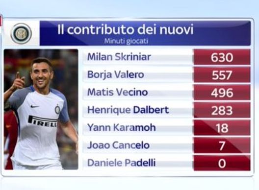 A SkySportsi è parlato del minutaggio dei nuovi giocatori nerazzurri, quelli arrivati questa estate e al primo posto, nella classifica sui minuti giocati, Milan Skriniar è al primo posto: ne ha giocati 630. Il difensore acquistato dalla Sampdoria si è messo in mostra per continuità e per sicurezza, la sua e quella che ha dato a tutto il reparto, tanto che pure Miranda - che aveva chiuso male la scorsa stagione - sembra aver ritrovato il giusto smalto. La new entry che ha giocato meno è il portiere ex Toro, Padelli, che ha ancora collezionato zero minuti. Joao Cancelo ha giocato solo sette minuti, poi si è infortunato con la Nazionale portoghese. Nelle prossime ore si capirà se inizierà ad allenarsi con il gruppo dopo tanti allenamenti a parte per recuperare ed è "uno di quelli che può dare alternative all'Inter", sia in avanti che in difesa. Gli altri calciatori arrivati alla Pinetina la scorsa estate sono Borja Valero che ha giocato per 557 minuti, Matias Vecino 496 minuti, Henrique Dalbert 283 minuti, Yann Karamoh 18 minuti.