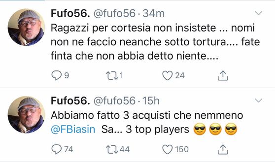 Il padre di Fognini, grande tifoso interista, ha condiviso un'indiscrezione sui social in merito al mercato nerazzurro che ha agitato positivamente i tifosi. Fulvio ha lanciato la bomba con questo tweet: "Abbiamo fatto tre acquisti che nemmeno Fabrizio Biasin sa... Tre top players". Immediate le reazioni dei tifosi nerazzurri, che hanno sommerso il padre del tennista di domande e curiosità per riuscire a capire l'identikit degli acquisti: "Roba grossa? Molto grossa e alta... Tre stranieri, di più non dico. Ci sono nomi che la stampa non ha ancora fatto? Sì. Il mio amico dirigente mi ha detto per il momento di non divulgare. Se è fatta? Al 99%".