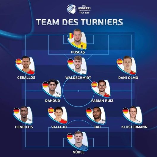 Puscas è l'unico esponente di una Nazionale diversa da Germania e Spagna, autentiche dominatrici del torneo. A Fabian Ruiz, giocatore del Napoli, il premio come migliore in assoluto.