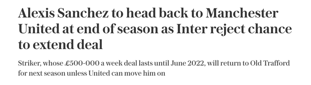 Con molta probabilità l'Inter rispedirà Alexis Sanchez al Manchester United. È quanto riporta il Telegraph che sottolinea come i nerazzurri non hanno intenzione di riscattare il cileno. L'infortunio rimediato in nazionale a ottobre e che lo ha tenuto lontano dai campi per 3 mesi, è stato l'ostacolo principale a un possibile riscatto da parte del club nerazzurro. Potrebbe quindi concludersi dopo una sola stagione l'esperienza a Milano dell'attaccante. Un problema enorme per il Manchester United alla luce del fatto che Sanchez guadagna 500 mila sterline a settimana e ha un contratto che scade il 30 giugno giugno del 2022. Il Telegraph sottolinea che al momento ci sono poche possibilità che un altro club cerchi di coprire il suo stipendio prendendo il giocatore in prestito.