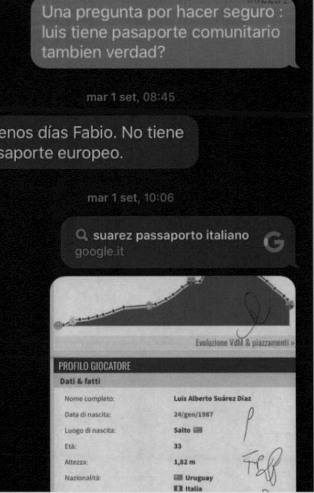 La mattina dopo, l'avvocato risponde che no, Suarez non ha un passaporto comunitario. Paratici, però, non si capacita e, ricordiamolo, dopo aver già raggiunto un accordo economico col calciatore, va a cercare su Google. Precisamente su Transfermarkt, sito specializzato. E manda a sua volta uno screenshot all'avvocato Zaldua.