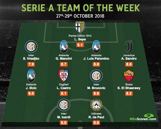 Lo show dell'Inter all'Olimpico contro la Lazio ha ripercussioni anche sulla top 11 della Serie A per quanto riguarda l'ultimo turno. Come sempre, il sito di statistiche Whoscored elegge i migliori ruolo per ruolo. E sono ben tre gli interisti in formazione, solo l'Atalanta pareggia il numero degli interisti. Oltre a Brozovic e Icardi, ovviamente scelti, spicca anche la presenza di Sime Vrsaljko, sempre più a suo agio dopo il rientro dall'infortunio. Ecco la formazione scelta: