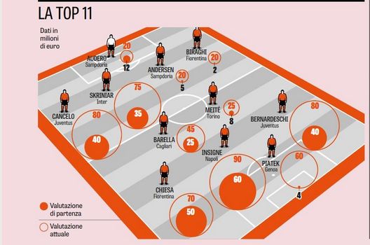 Le valutazioni, nel calciomercato, si sa sono arbitrarie. La Gazzetta dello Sport ha deciso di stilare una top 11 e una flop 11 dei giocatori con il rendimento migliore e peggiore in questo inizio di stagione. Nella top 11 figura anche l'interista Milan Skriniar, che con una valutazione di partenza di 35 milioni di euro è già arrivato ora a quota 75. L'ex Cancelo, secondo la Rosea, vale 80 milioni mentre Barella, obiettivo nerazzurro per l'estate, è schizzato da 25 a 45.