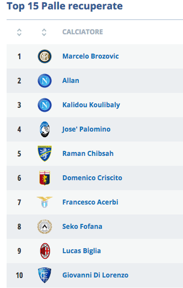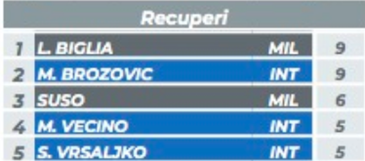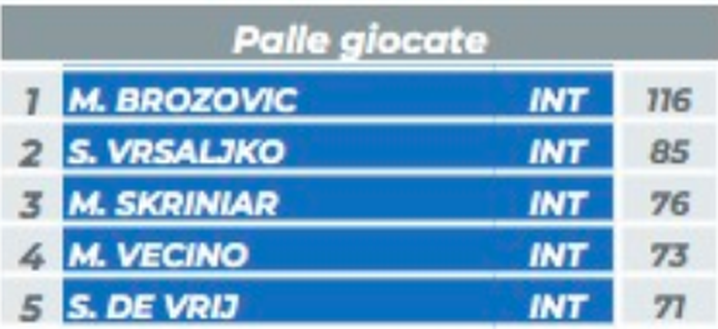 Anche ieri il centrocampista croato non ha fatto mancare la sua regia e si è messo al timone della manovra nerazzurra. Primo per palle giocate, 116 in tutta la gara; primo per passaggi riusciti, 88; primo, insieme a Biglia per palle recuperate, 9. Brozovic è al primo posto in Serie A per palle recuperato, ben 50, assieme al centrocampista del Napoli Allan.