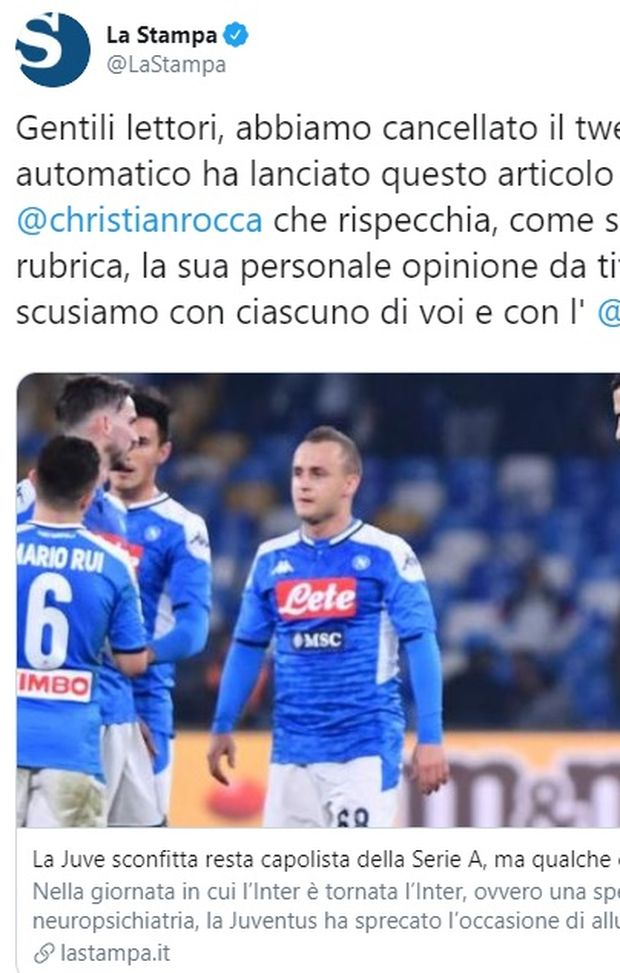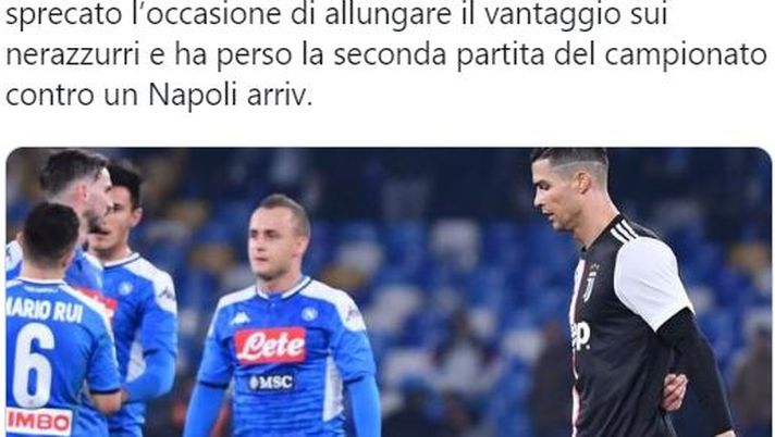 "Nella giornata in cui l’Inter è tornata l’Inter, ovvero una specie di reparto di neuropsichiatria, la Juventus ha sprecato l’occasione di allungare il vantaggio sui nerazzurri e ha perso la seconda partita del campionato contro un Napoli arrivato alla sfida del San Paolo dopo quattro sconfitte interne consecutive e con un distacco di ventisette punti dalla capolista".