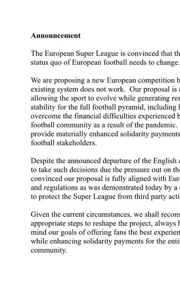 "La Superlega Europea è convinta che l'attuale status quo del calcio europeo debba cambiare. Proponiamo una nuova competizione europea perché il sistema esistente non funziona. La nostra proposta è finalizzata a consentire allo sport di evolversi generando risorse e stabilità per l'intera piramide calcistica, anche aiutando a superare le difficoltà finanziarie incontrate dall'intera comunità calcistica a causa della pandemia. Fornirebbe anche pagamenti di solidarietà materialmente migliorati a tutte le componenti calcistiche.