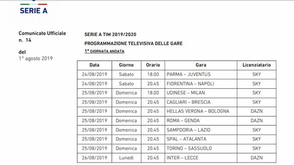 Dopo lo svelamento del calendario della Serie A 2019-20, avvenuto lunedì scorso, la Lega ha reso noti date, orari e programmazioni televisive delle prime due giornate del prossimo campionato. L'Inter esordirà lunedì 26 agosto alle ore 20.45 a San Siro contro il Lecce (DAZN), per poi andare a Cagliari, dove giocherà contro la squadra di Maran domenica 1 settembre alle 20.45 (Sky). Ecco la programmazione completa: