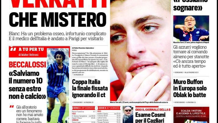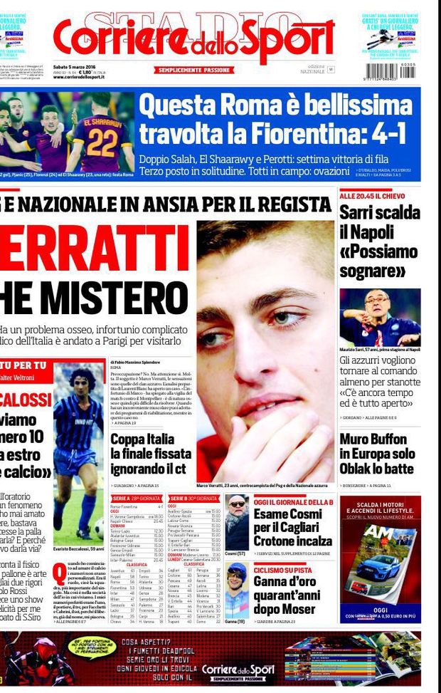 Prima pagina del Corriere dello Sport domani in edicola. Non si parla di Inter, spazio alla larga vittoria della Roma sulla Fiorentina e l'ansia che riguarda le condizioni di Marco Verratti, centrocampista del PSG e della nazionale, alle prese con un brutto infortunio. Intervista a Evaristo Beccalossi che lancia l'appello: "Salviamo il numero 10, senza estero non è calcio"