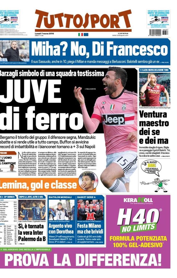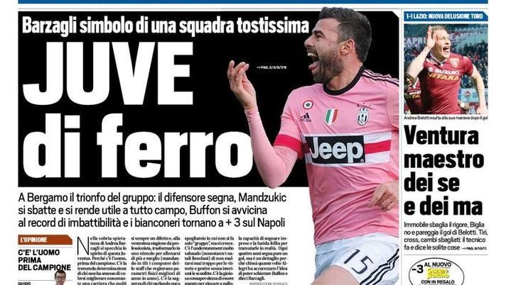 Sulla prima pagina di TuttoSport, tra qualche ora in edicola, spazio alla vittoria della Juve contro il Sassuolo: "Juve di ferro. Barzagli simbolo di una squadra tostissima", si legge sul quotidiano sportivo.
