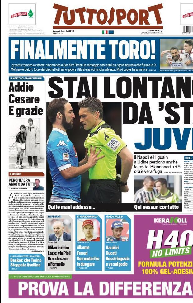 "Finalmente Toro" è il titolo di Tuttosport in edicola tra qualche ora. Secondo il quotidiano torinese: "I granata tornano a vincere, rimontando a San Siro l'Inter (in vantaggio con Icardi su rigore ingiusto) che finisce in 9: Molinaro e Belotti (pure dal dischetto) fanno godere i tifosi e avvicinano la salvezza. Maxi Lopez trascinatore."