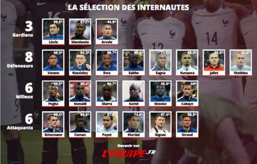 Quale Francia per l'Europeo che si disputa in casa? Il quotidiano "L'Equipe" ha chiesto ai suoi lettori di disegnare la rosa dei 23 che dovrebbe convocare Didier Deschamps. Geoffrey Kondogbia, che ha scarse possibilità di essere presente, non è stato inserito tra i sei centrocampisti dai lettori transalpini, che hanno scelto questi 23: