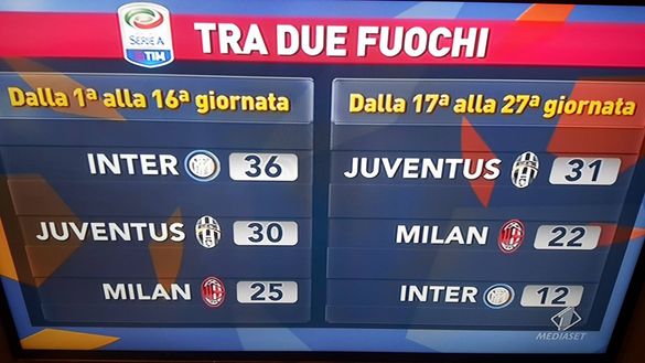 Dalle stelle alle stalle. Crollo verticale, vertiginoso, che non stenta a placarsi. L'Inter è costretta a fare i conti con la doppia personalità che in questa stagione l'ha portata dal vertice della classifica al quinto posto, con un solo punto di vantaggio sul Milan. Nel corso di TikiTaka, i colleghi di Mediaset hanno evidenziato il drastico cambiamento di rotta della squadra di Mancini che ha collezionato ben 36 punti in 16 giornate, 6 in più della Juve e ben 11 in più del Milan, e soltanto 12 punti dalla 17esima giornata alle 27 esima, rispetto ai 31 della Juventus e ai 22 del Milan.