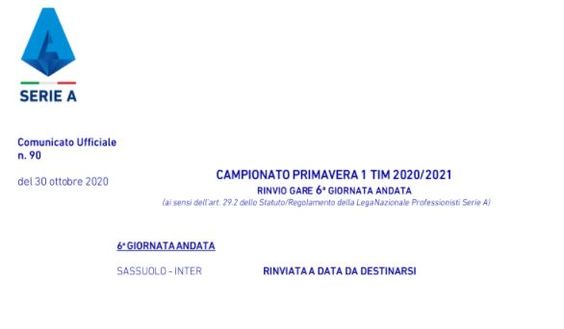 Primavera, Sassuolo-Inter rinviata a data da destinarsi