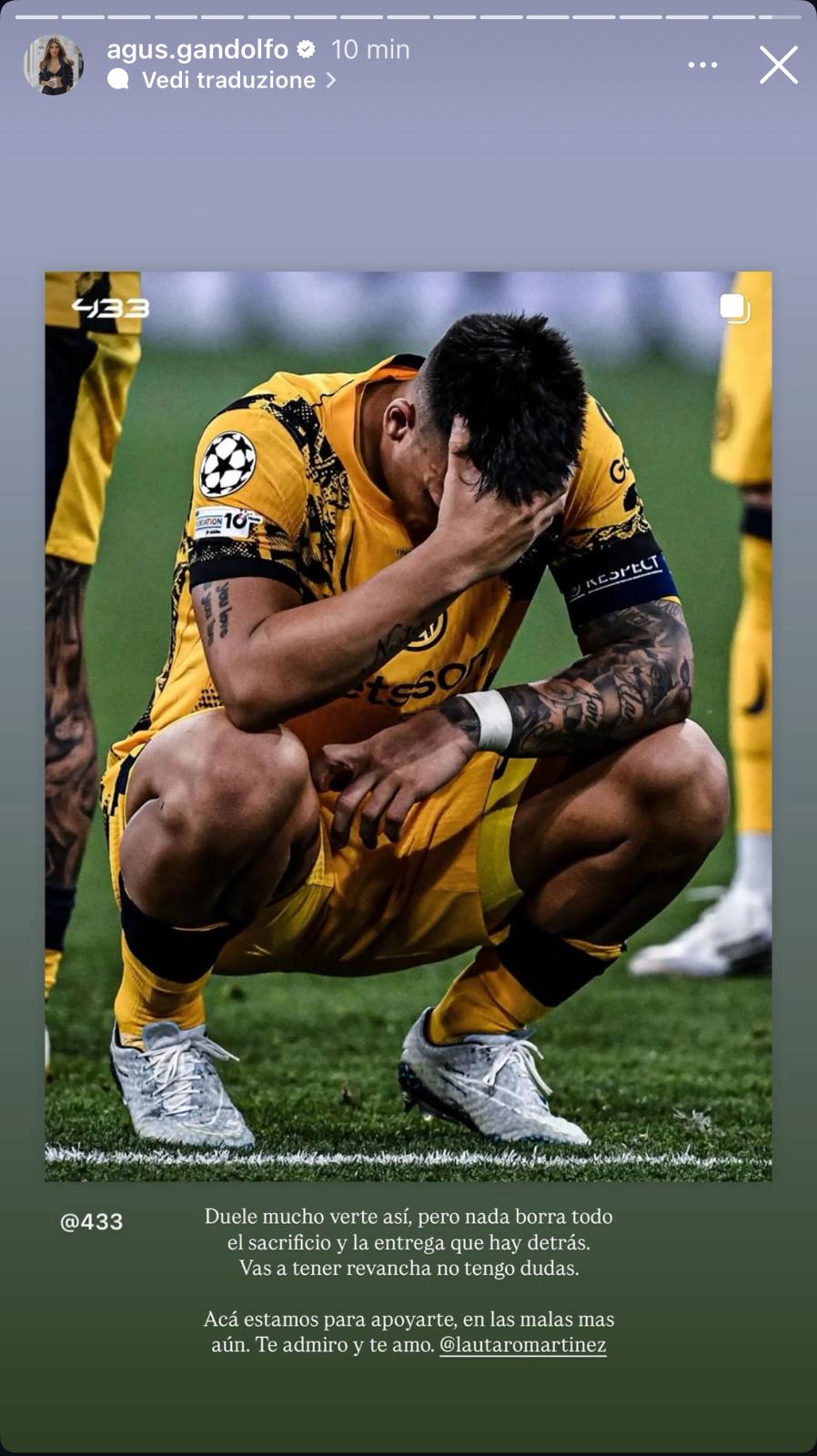La moglie del capitano dell'Inter, Lautaro Martinez, ha postato sul suo profilo Instagram una dedica dopo la finale persa dall'Inter col Psg. Queste le parole di Agustina sui social:
