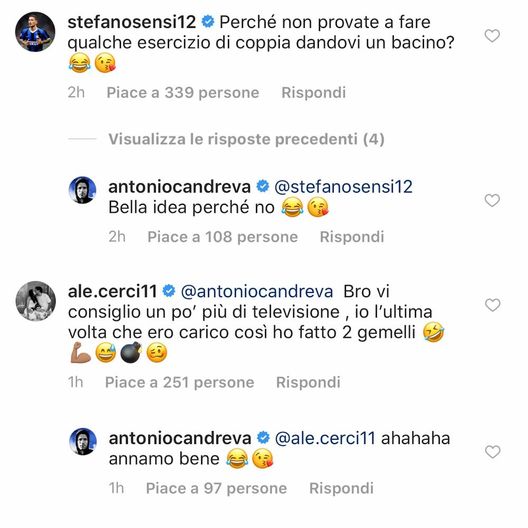 Antonio Candreva si allena in coppia con la fidanzata Allegra. I due stanno condividendo quotidianamente video di esercizi eseguiti insieme e spesso conditi da baci innamorati. La cosa non è passata inosservata a diversi calciatori e compagni di squadra del giocatore nerazzurro. Stefano Sensi lo ha sfottuto così: "Perché non provate a fare qualche esercizio di coppia dandovi un bacino?". "Bella idea, perché no", è stato al gioco Candreva. Anche Alessio Cerci è intervenuto: "Vi consiglio un po' più di televisione, io l'ultima volta che ero così carico ho fatto due gemelli!". La risposta di Candreva: "Annamo bene...".
