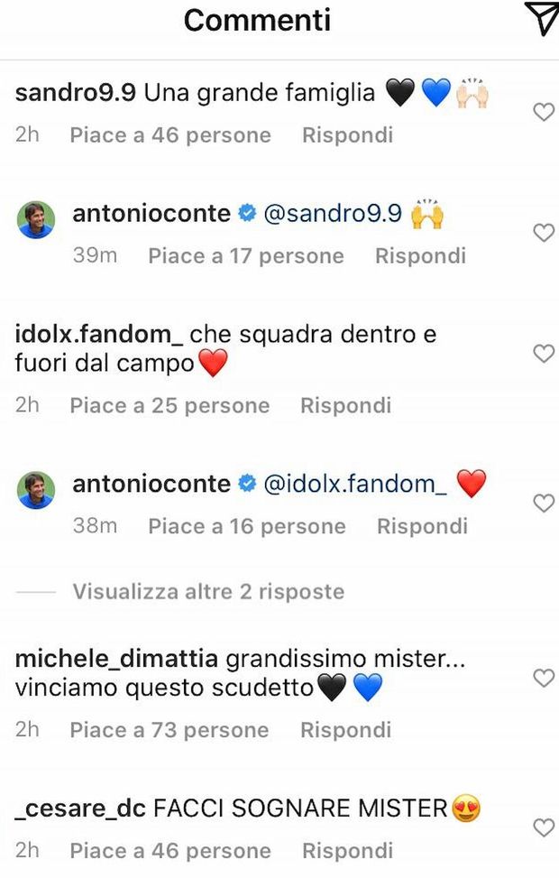 Antonio Conte sempre più interista, sempre più dentro l'Inter. Lo abbiamo sentito dire tante volte in questi giorni, lo hanno raccontato in tanti a stretto contatto con l'allenatore, vero artefice della cavalcata interista verso il 19° scudetto della storia nerazzurra. E anche i tifosi avvertono quanto Conte tenga a questo progetto. E non smettono mai di riconoscergli il lavoro a Milano e l'attaccamento dimostrato verso la società. Sotto l'ultimo post pubblicato dallo stesso Conte su Instagram, infatti, sono spuntati tanti commenti di tifosi nerazzurri, che hanno invocato il mister con messaggi d'affetto.