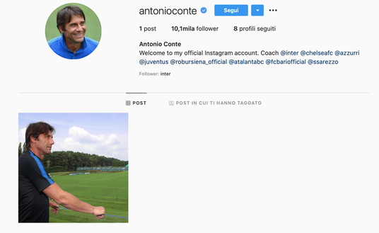 Svolta social per Antonio Conte. Il tecnico dell'Inter è infatti sbarcato oggi su Instagram, aprendo il proprio profilo personale. Ha annunciato infatti: "Da oggi lancio il mio account ufficiale". Tra i pochi seguiti dall'allenatore c'è ovviamente il club nerazzurro, il fratello e membro del suo staff Daniele, l'Uefa, la Champions League e la Nazionale italiana.