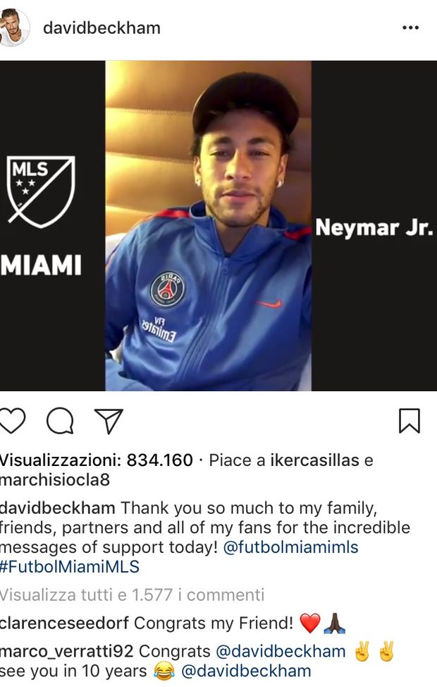 David Beckham ha annunciato oggi i dettagli del progetto al quale sta lavorando da alcuni anni: riportare il calcio a Miami con una squadra in MLS e uno stadio dedicato. Tantissimi i messaggi di sostegno e di affetto che i personaggi dello sport e non solo gli hanno inviato tramite i social. L'ex giocatore del Manchester United ha ringraziato tutti e tra i commenti al suo post è spuntato anche un simpatico messaggio di Marco Verratti: "Congratulazioni! Ci vediamo tra dieci anni!"