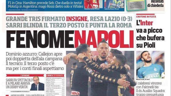 Sulla prima pagina del Corriere dello Sport si parla anche del tonfo dell'Inter a Crotone: "L'Inter va a picco che bufera su Pioli. I calabresi vincono con Falcinelli bis. Il ds Ausilio: Squadra troppo presuntuosa".
