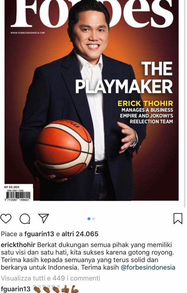 Erick Thohir, ex presidente del club nerazzurro, ha espresso il suo ringraziamento sul suo profilo Instagram per il riconoscimento della versione indonesiana della rivista Forbes. Il dirigente è stato eletto "uomo d'affari dell'anno". A raggiungere questo traguardo ha contribuito anche l'esperienza nerazzurra. Ed è proprio un ex giocatore dell'Inter (Fredy Guarin) a commentare il suo post complimentandosi con lui.