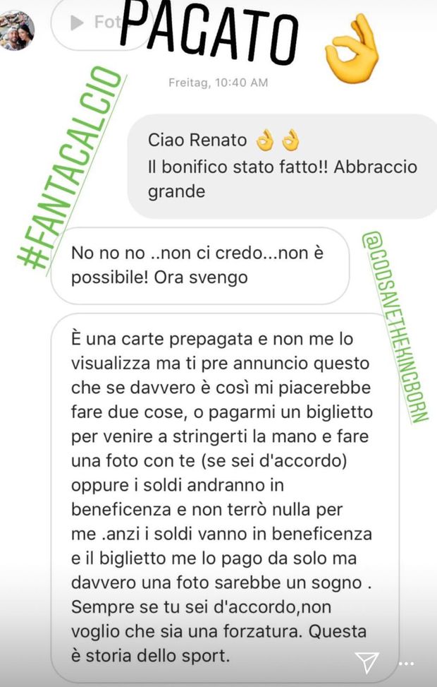 Il mercato di gennaio ha privato il Sassuolo di uno dei suoi giocatori più rappresentativi: Kevin Prince Boateng. Un duro colpo per i tifosi, De Zerbi e soprattutto i fantallenatori. Un tifoso - su Instagram - gli ha scritto che per comprarlo aveva speso diversi crediti: "Dovresti rimborsarmi, ora che faccio? Ti mando il mio IBAN?". E il giocatore ha prontamente risposto: "Mandamelo". Ed è stato di parola. Perché Boateng ha davvero rimborsato il fantallenatore come dimostrano le sue storie su Instagram: "Pagato! Ciao Renato, il bonifico è stato fatto. Ti mando un abbraccio". Il tifoso è rimasto sorpreso: "Non è possibile, non ci credo, ora svengo. Mi piacerebbe fare due cose, ringraziarti di persona o dare questi soldi in beneficenza. Anzi, oppure facciamo così. I soldi vanno comunque in beneficenza e il biglietto me lo pago da solo. Sarebbe un sogno fare una foto con te, ma solo se sei d'accordo. Non voglio sia una forzatura, questa è storia dello sport".