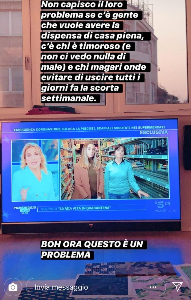 Giulia Amodio, fidanzata di Stefano Sensi, è tornata a commentate l'emergenza da Coronavirus. Ieri la modella aveva dichiarato di avere paura e di essere ipocondriaca. Oggi ha difeso tutte quelle persone che, mosse da psicosi, hanno deciso di svuotare i supermercati lasciando gli scaffali vuoti: "Non capisco il loro problema se c'è gente che vuole avere la dispensa di casa piena, c'è chi è timoroso (e non ci vedo nulla di male) e chi magari per evitare di uscire tutti i giorni fa la scorta settimanale". Boh, ora questo è un problema". Poi, riferendosi al servizio andato in onda nel programma della D'Urso che condannava la psicosi, ha aggiunto polemica: "Sarei curiosa di andare a casa della D'Urso e aprire la sua credenza".