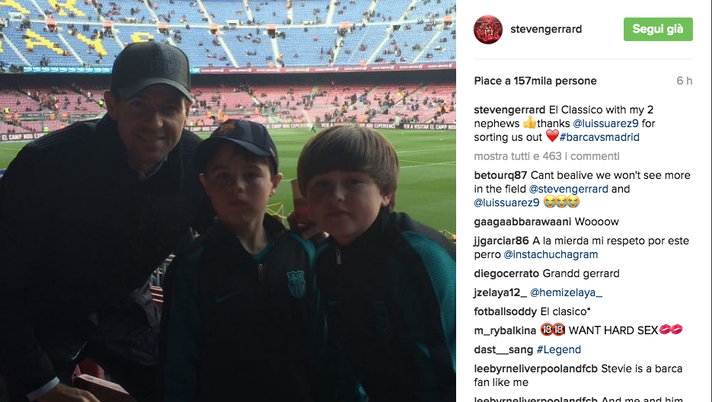 Ieri al Camp Nou c'erano 98,485 spettatori per assistere alla partita più attesa di Spagna, il Classico tra Barcellona e Real Madrid. Tra i quasi 100 mila spettatori, c'era Steven Gerrard, la leggenda del calcio inglese che su invito di Luis Suarez ha assistito alla partita. I due sono stati compagni nel Liverpool per tre anni, dal 2011 al 2014. L'ex capitano dei Reds era al camp Nou con i suoi due nipoti e attraverso il suo account Instagram ha ringraziato l'attaccante del Barcellona: "Il Classico con i miei due nipoti. Grazie Luis Suarez per averci invitato"