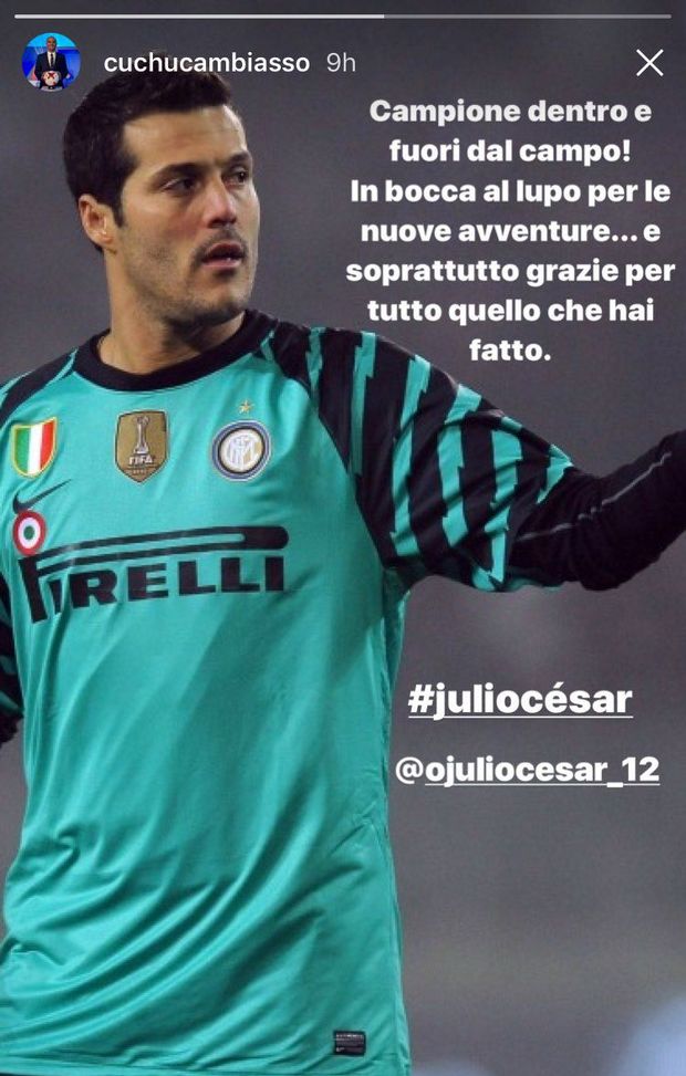 "Campione dentro e fuori dal campo! In bocca al lupo per le nuove avventure...e soprattutto grazie per tutto quello che hai fatto". È il messaggio che Esteban Cambiasso ha mandato al suo ex compagno ai tempi dell'InterJulio Cesar. Il portiere ieri ha rescisso il suo contratto con il Benfica e potrebbe decidere di ritirarsi anche se l'ipotesi di un ritorno in Brasile è sempre viva.