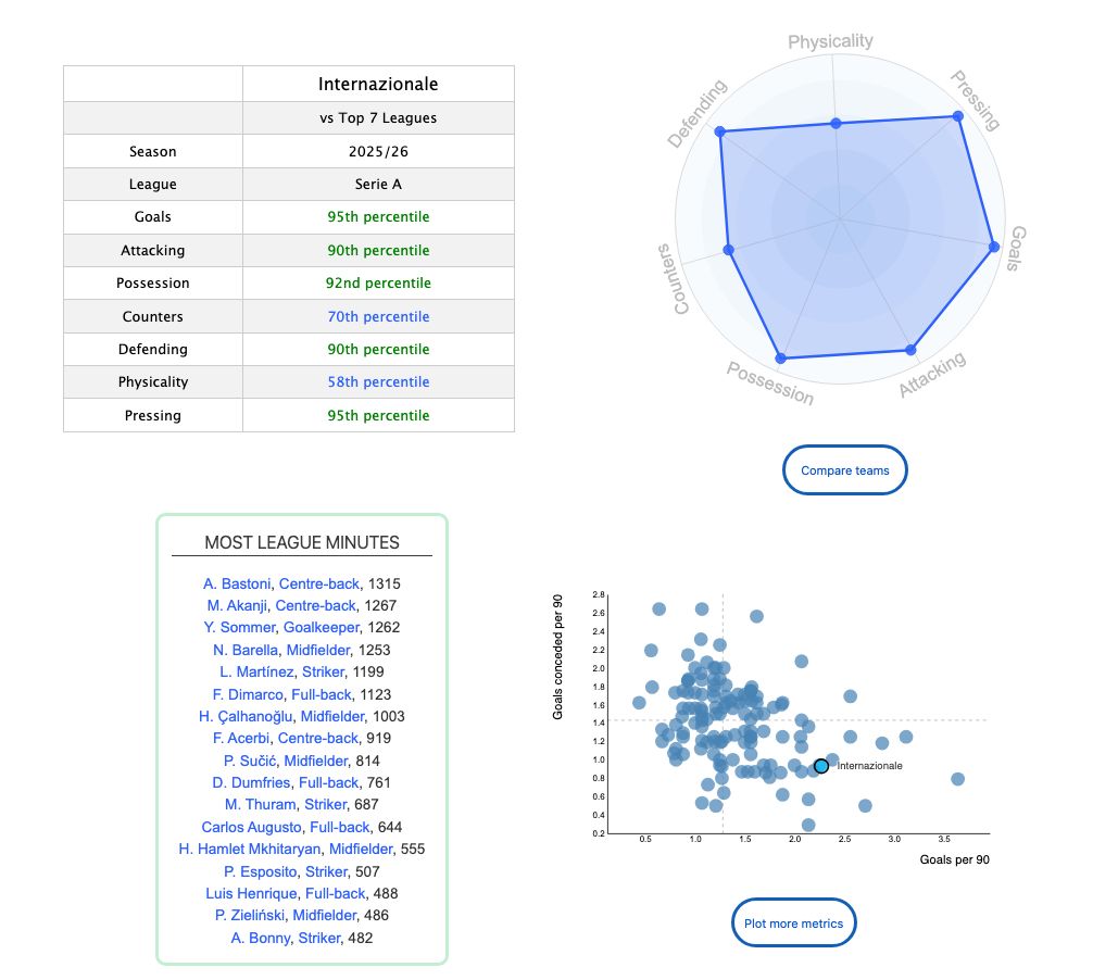 I nerazzurri si collocano infatti nei percentili più d'Europa in tutte le principali fasi di gioco: 95° percentile per gol segnati e pressing, 92° per possesso palla, 90° per produzione offensiva e solidità difensiva.