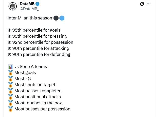 Nel complesso, i numeri descrivono un’Inter dominante, equilibrata e moderna: una squadra che eccelle in ogni fase del gioco e che, dati alla mano, rappresenta il punto di riferimento della Serie A in questa stagione.