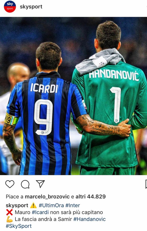 Mauro Icardi non sarà più Capitan dell'Inter, la fascia va a Samir Handanovic. La notizia, che è rimbalzata sui social oggi nelle prime ore del pomeriggio, ha registrato diverse reazioni da parte dei tifosi ma anche di alcuni giocatori. Una su tutte quella di Marcelo Brozovic, che ha messo mi piace alla news postata da Sky Sport su Instagram. Lo stesso elemento è piaciuto anche ad un giocatore della Juventus, amico di Ivan Perisic. Si tratta di Pjanic: la sua famiglia e quelle di Perisic e Dzeko hanno trascorso insieme il Capodanno negli Emirati Arabi.