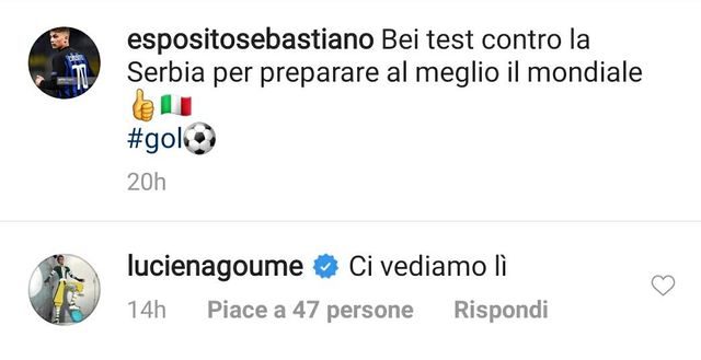 "Tra i tanti calciatori dell'Inter in giro per il mondo con le rispettive Nazionali ci sono anche Sebastiano Esposito e Lucien Agoume: i due baby talenti nerazzurri, classe 2002, sono scesi in campo con l'Italia Under 18 il primo (dppia sfida contro la Serbia) e con la Francia Under 18 il secondo (nell'ambito del Torneo di Limoges). L'intesa tra i due, emersa già durante il ritiro estivo con l'Inter, si è vista anche sui social. Al post su Instagram pubblicato dall'attaccante azzurro ("Bei test contro la Serbia per preparare al meglio il Mondiale") è arrivata la risposta del centrocampista francese ("Ci vediamo lì"): chiaro il riferimento al Mondiale Under 17, in programma a partire dal 26 ottobre in Brasile, dove entrambi saranno grandi protagonisti.